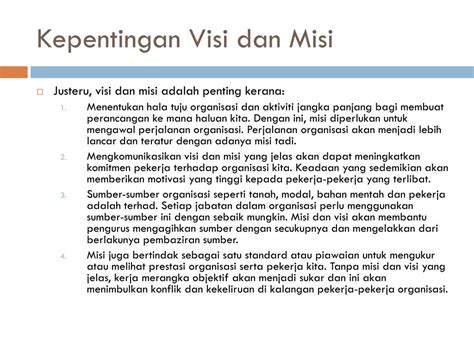 Banyak intepretasi yang dapat keluar dari pernyataan keadaan ideal yang ingin dicapai lembaga tersebut. Maka, bagi anda yang akan mencalonkan sebagai kepala desa, juga berlaku bagi anda warga desa kiranya perlu memahami. Sebenarnya, apa itu visi dan misi (vision and mission)? Memberikan layanan yang sopan terhadap pelanggan. Semua jenis organisasi wajib memilikinya loh, sebagai pedoman untuk menjalankan kegiatan organisasi. Setiap perusahaan harus memiliki pernyataan tujuan yang tepat untuk membuat orang bersemangat tentang apa yang dilakukan perusahaan dan memotivasi. Untuk menjadi pusat ilmu berasaskan penyelidikan multidisiplin, pengembangan dan khidmat profesional dalam teknologi automotif. Visi dan misi adalah konsep perencanaan tentang bagaimana menjalani perencanaan tersebut untuk mencapai tujuan yang diharapkan dalam waktu tertentu. Meningkatkan ketersediaan sarana dan prasarana umum yang aman dan nyaman melalui program peningkatan sarana prasarana umum. Misi perusahaan adalah tujuan dan alasan mengapa perusahaan itu ada. Misi mengeluarkan dan membekalkan produk makanan halal dan menepati citarasa tempatan dan antarabangsa. Menjamin kualiti fabrik, rekaan dan jahtan tudung serta manik dan sulaman akan sentiasa terjamin dan menambat hati pelanggan. 2.1 mengenalpasti aktiviti perniagaan syarikat yang dijalankan oleh proton holdings berhad.